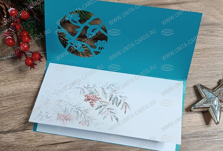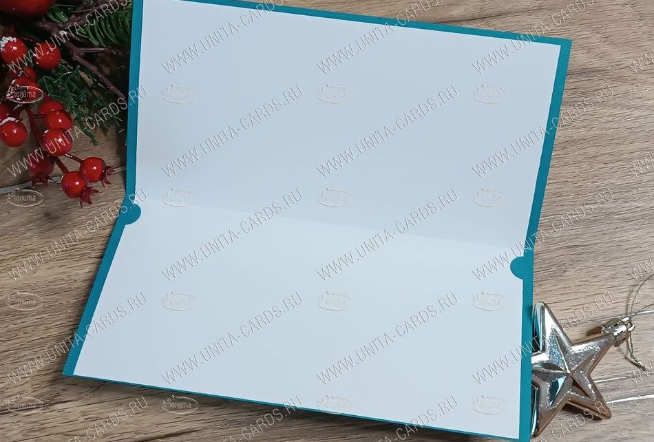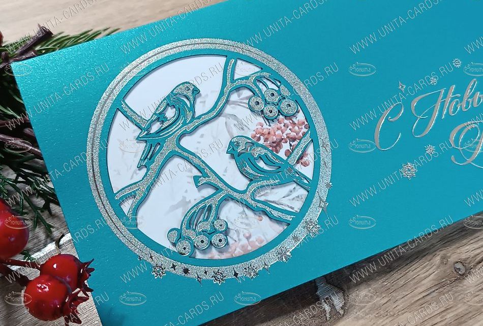 Новинка! Новогодняя корпоративная открытка разработана компанией ЮНИТА, изготовлена из металлизированной плотной бумаги, тиснение фольгой 1 цвет, исполнена ажурная лазерная резка. В комплекте вкладыш и конверт.