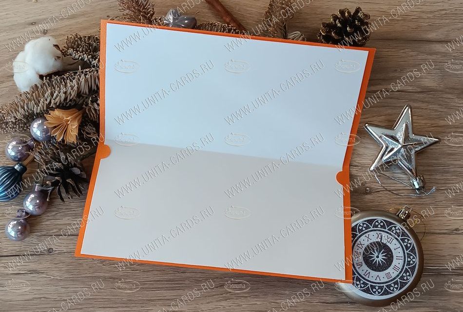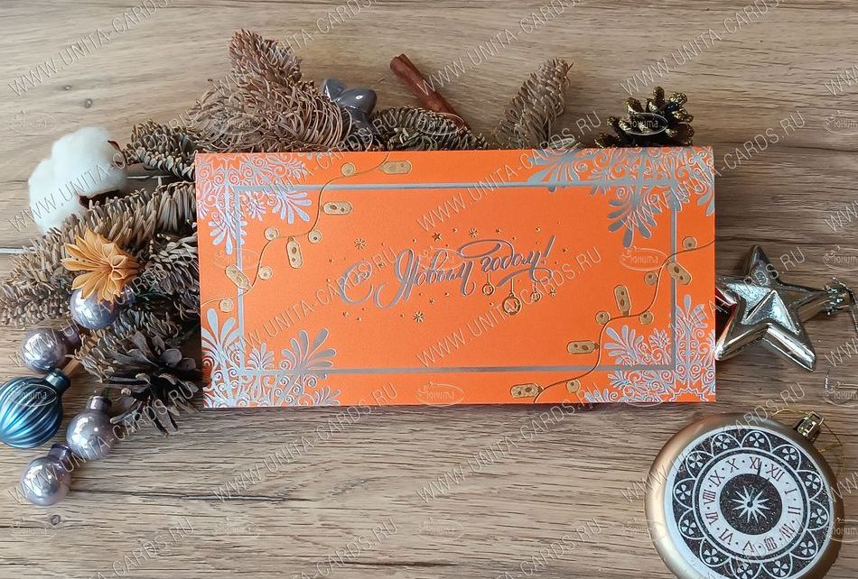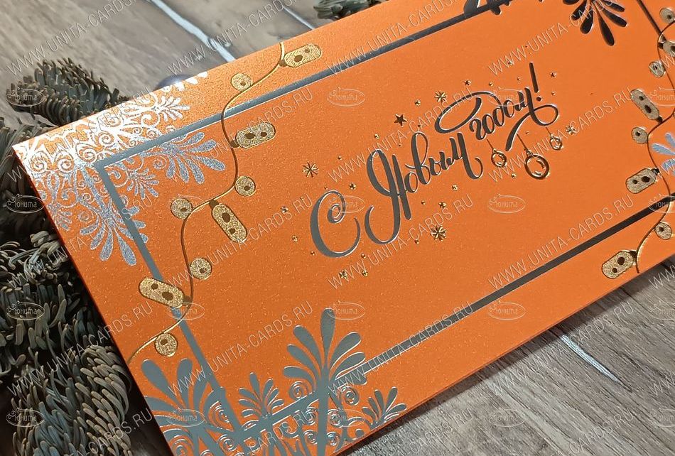 Новинка! Новогодняя корпоративная открытка разработана компанией ЮНИТА, изготовлена из дизайнерской металлизированной плотной бумаги, тиснение фольгой в 2 цвета.