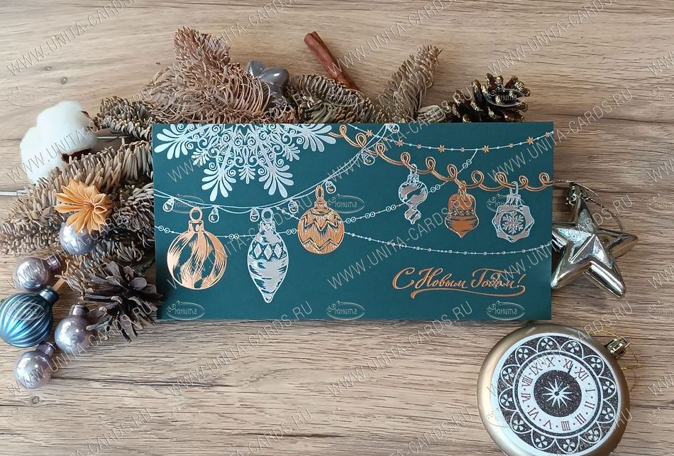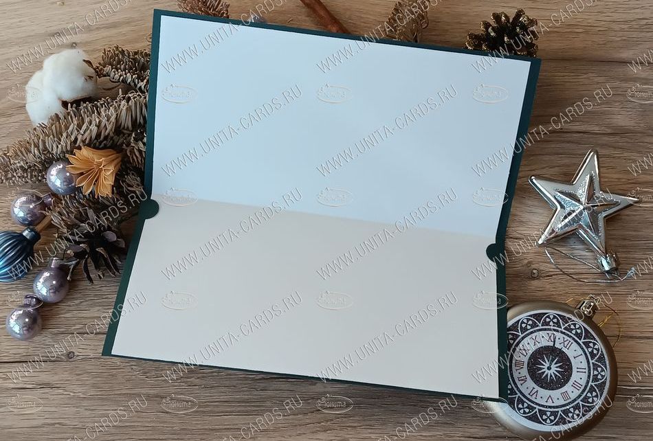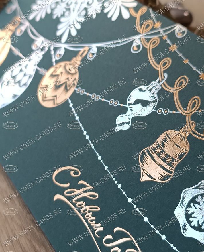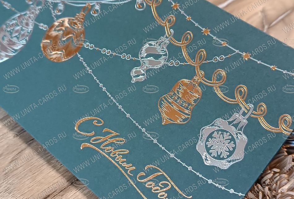 Новинка! Новогодняя корпоративная открытка разработана компанией ЮНИТА, изготовлена из дизайнерской плотной бумаги, тиснение фольгой в 2 цвета.