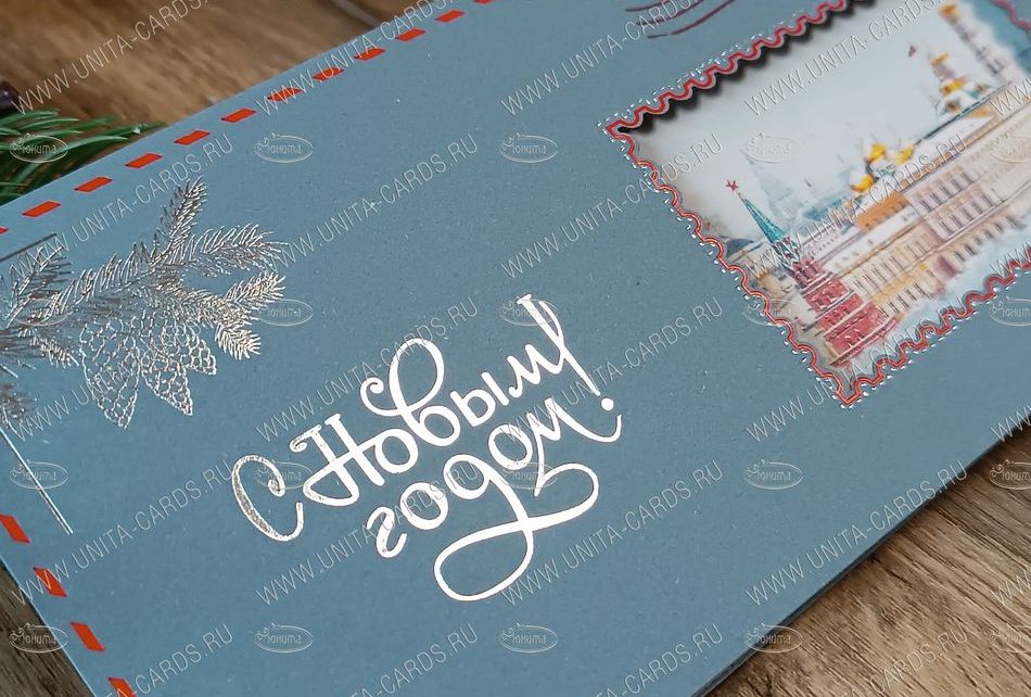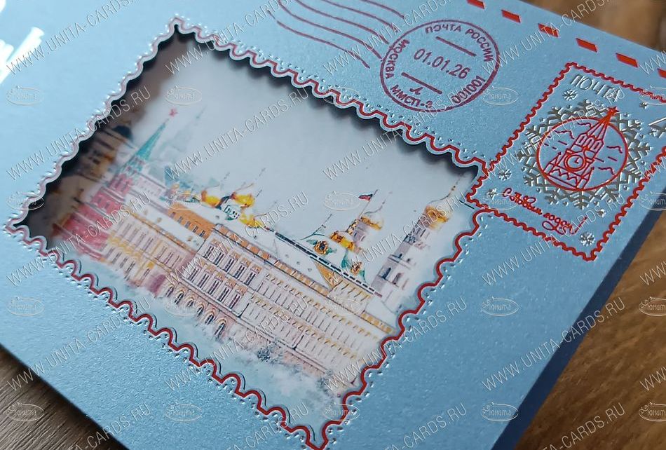 Новинка! Новогодняя корпоративная открытка разработана компанией ЮНИТА, изготовлена из дизайнерской плотной бумаги, тиснение фольгой в 2 цвета, исполнена ажурная лазерная резка, цветная печать почтового штампа с датой.