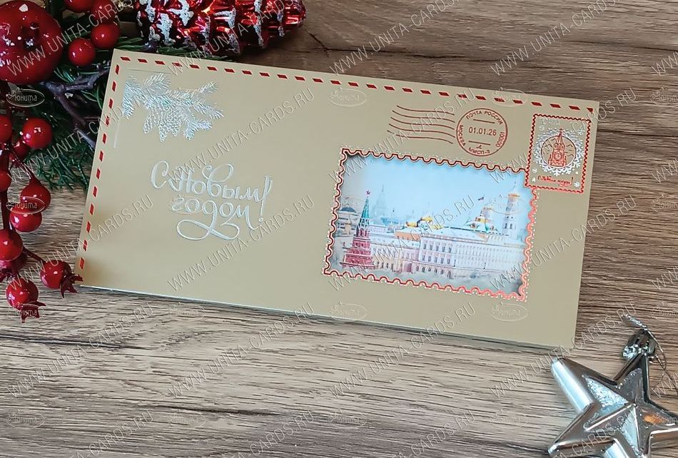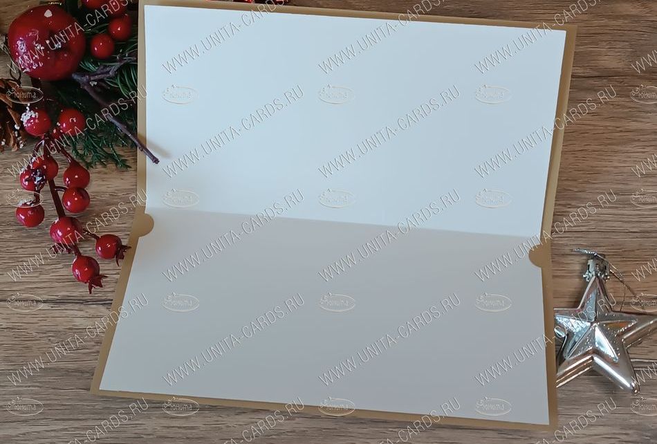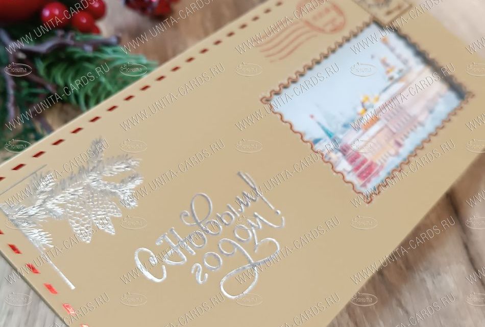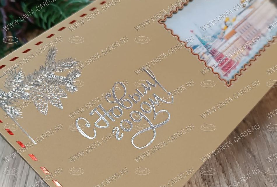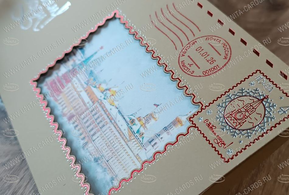 Новинка! Новогодняя корпоративная открытка разработана компанией ЮНИТА, изготовлена из lдизайнерской плотной бумаги, тиснение фольгой в 2 цвета, исполнена ажурная лазерная резка, цветная печать почтового штампа с датой.