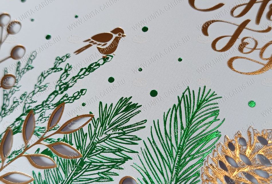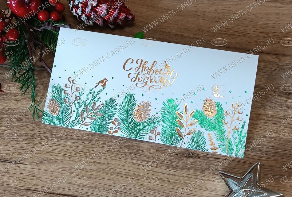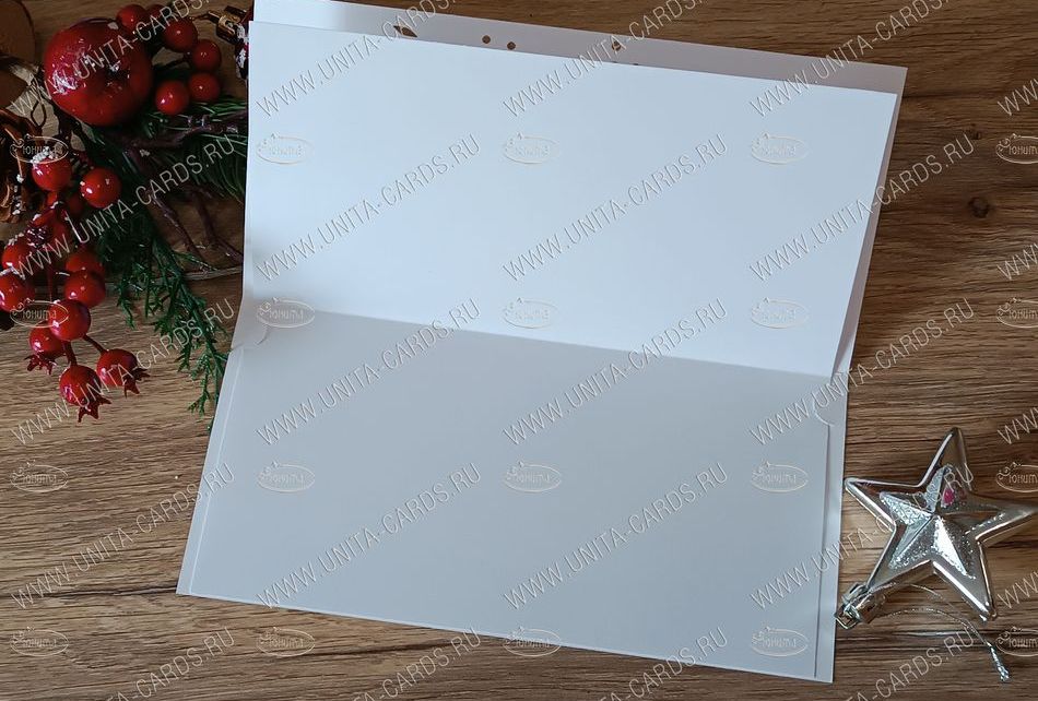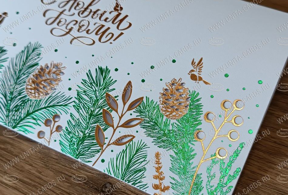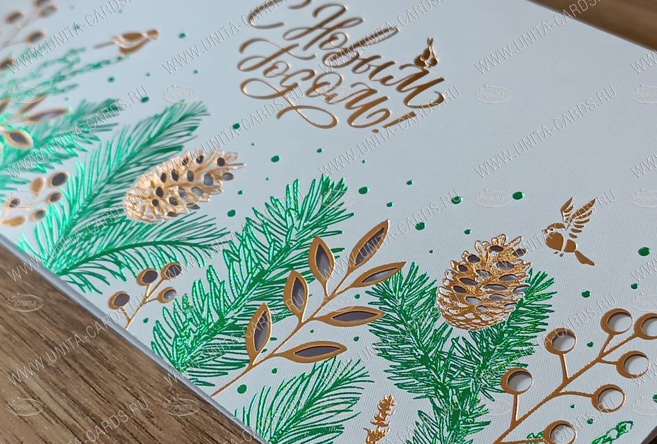 Новинка! Новогодняя корпоративная открытка разработана компанией ЮНИТА, изготовлена из дизайнерской текстурной плотной бумаги, тиснение фольгой в 2 цвета, исполнена ажурная лазерная резка.