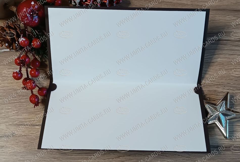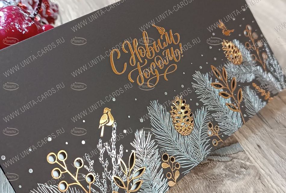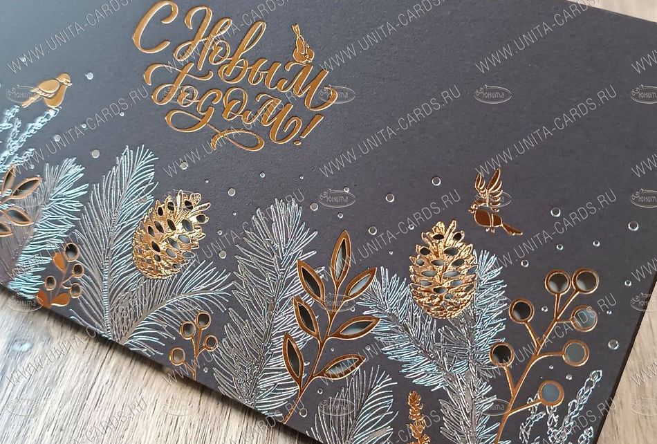 Новинка! Новогодняя корпоративная открытка разработана компанией ЮНИТА, изготовлена из дизайнерской плотной бумаги, тиснение фольгой в 2 цвета, исполнена ажурная лазерная резка.