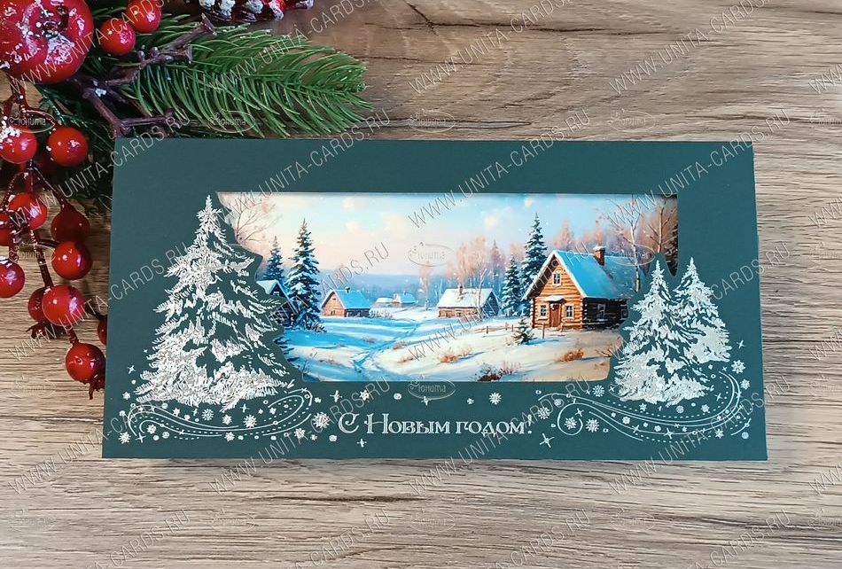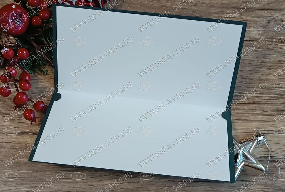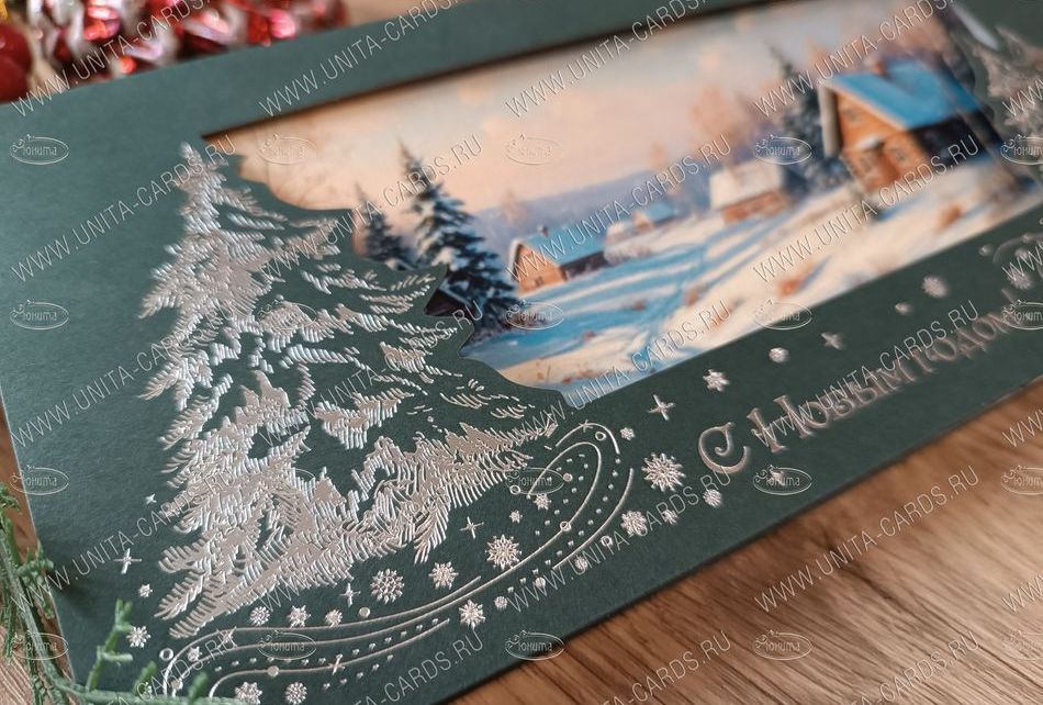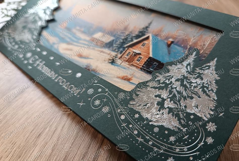 Новинка! Новогодняя корпоративная открытка разработана компанией ЮНИТА, изготовлена из дизайнерской плотной бумаги, тиснение фольгой 1 цвет, фигурная вырубка.