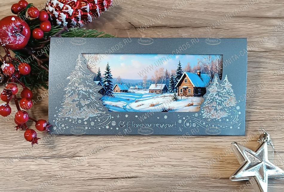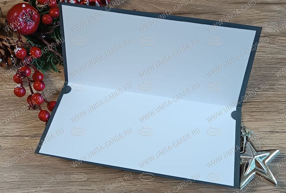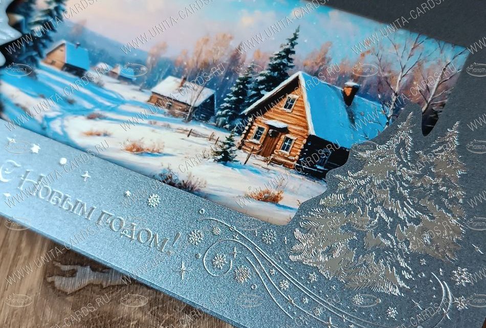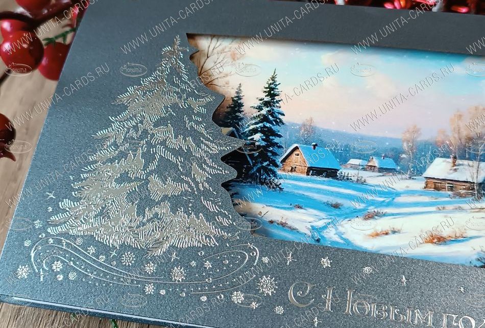 Новинка! Новогодняя корпоративная открытка разработана компанией ЮНИТА, изготовлена из металлизированной плотной бумаги, тиснение фольгой 1 цвет, фигурная вырубка.