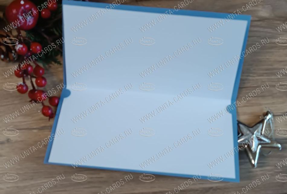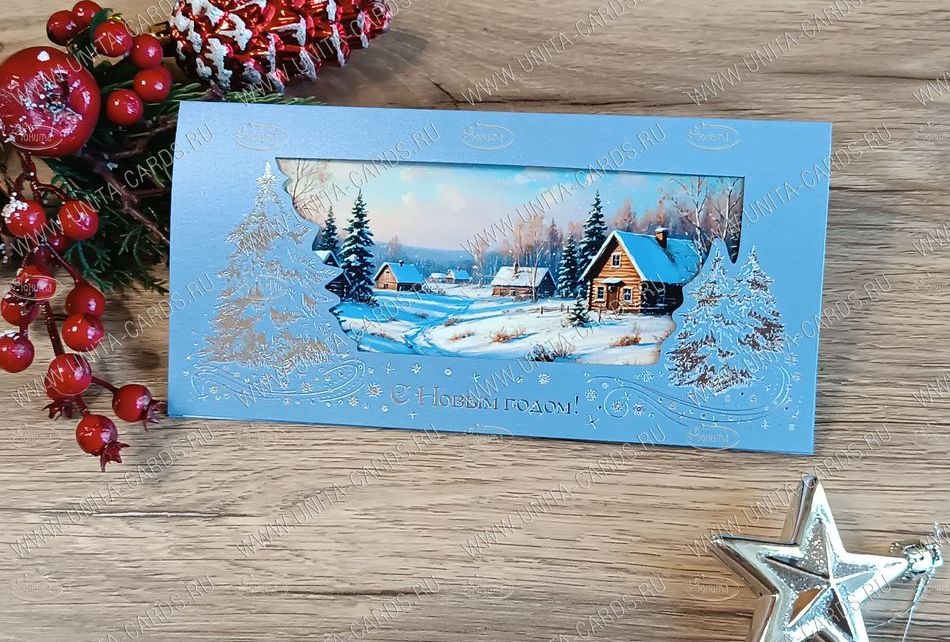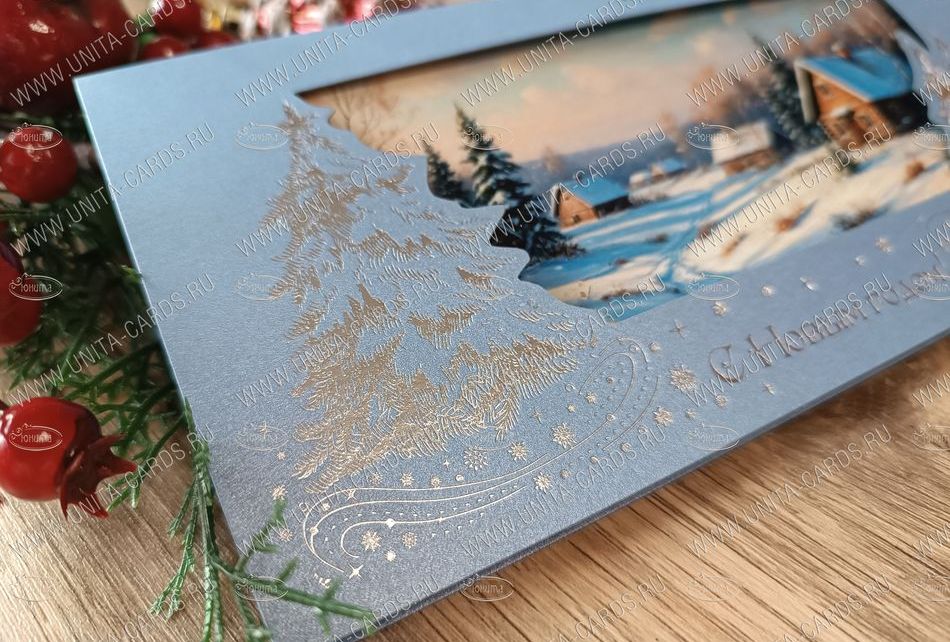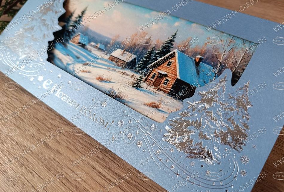 Новинка! Новогодняя корпоративная открытка разработана компанией ЮНИТА, изготовлена из металлизированной плотной бумаги, тиснение фольгой 1 цвет, фигурная вырубка.