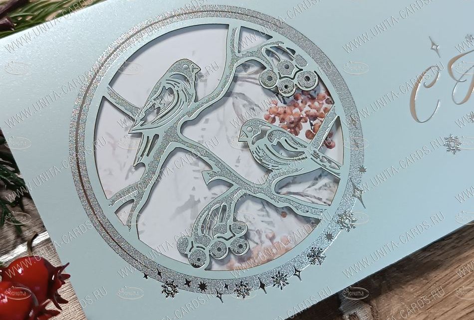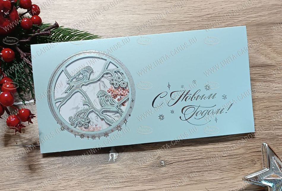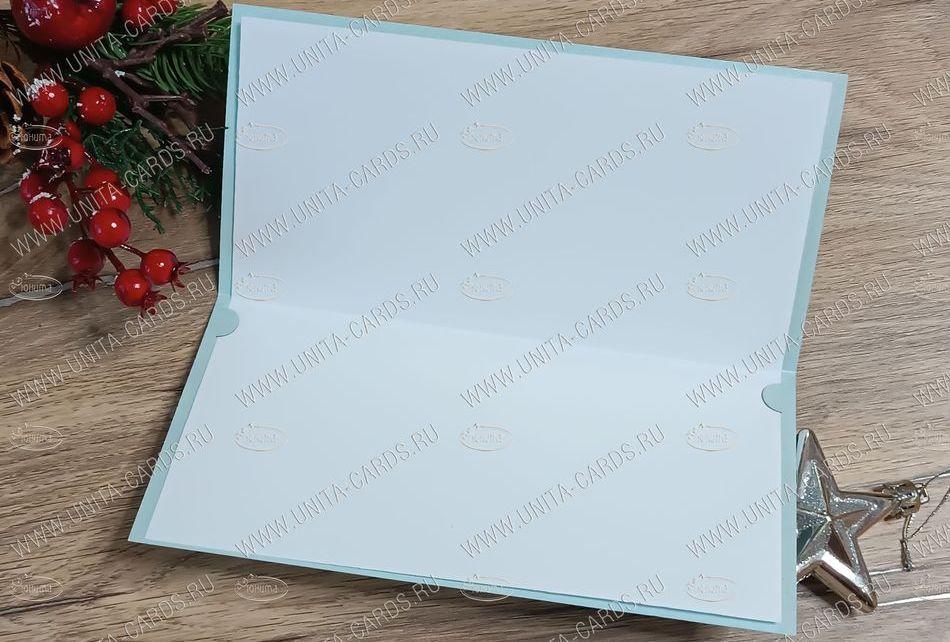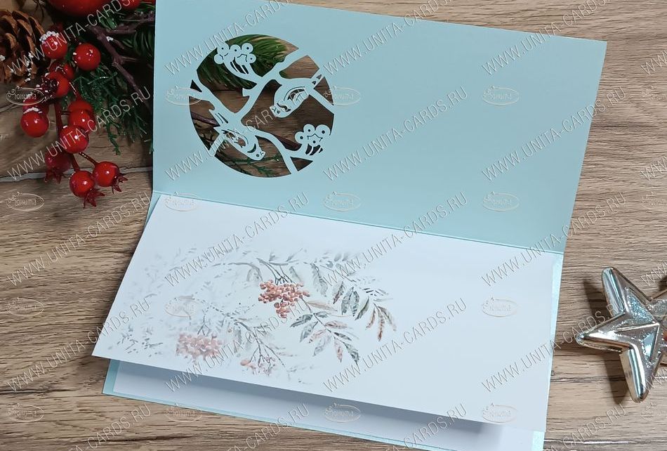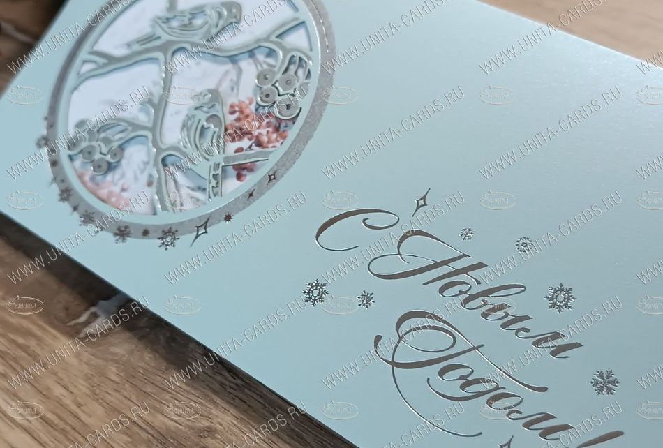 Новинка! Новогодняя корпоративная открытка разработана компанией ЮНИТА, изготовлена из металлизированной плотной бумаги, тиснение фольгой 1 цвет, исполнена ажурная лазерная резка.