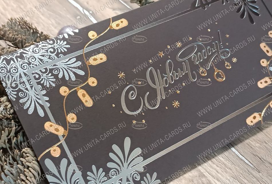 Новинка! Новогодняя корпоративная открытка разработана компанией ЮНИТА, изготовлена из дизайнерской плотной бумаги, тиснение фольгой в 2 цвета.