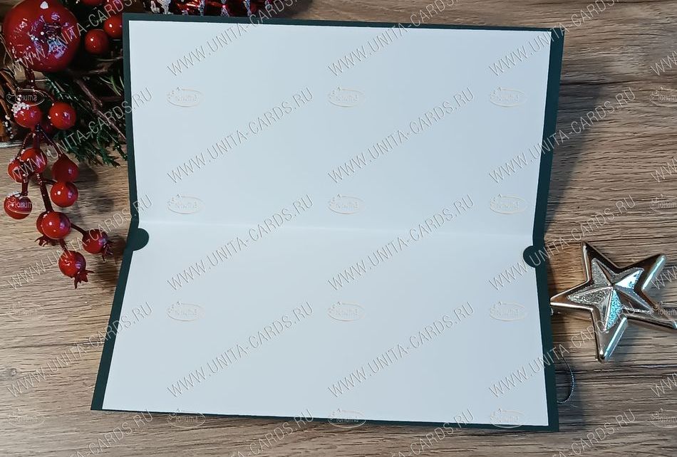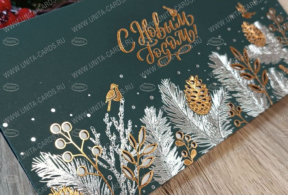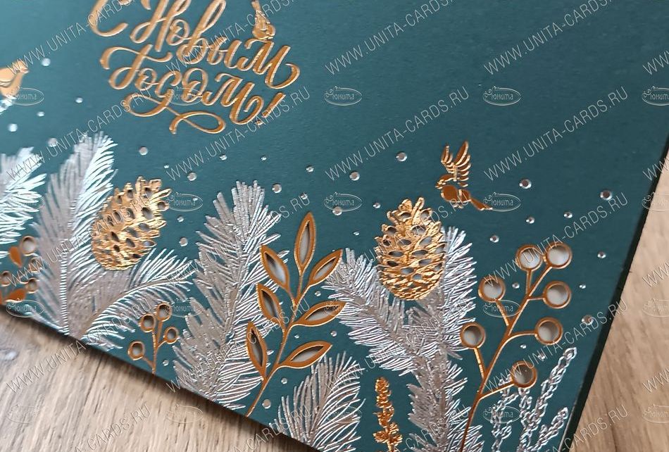Новинка! Новогодняя корпоративная открытка разработана компанией ЮНИТА, изготовлена из дизайнерской плотной бумаги, тиснение фольгой в 2 цвета, исполнена ажурная лазерная резка.